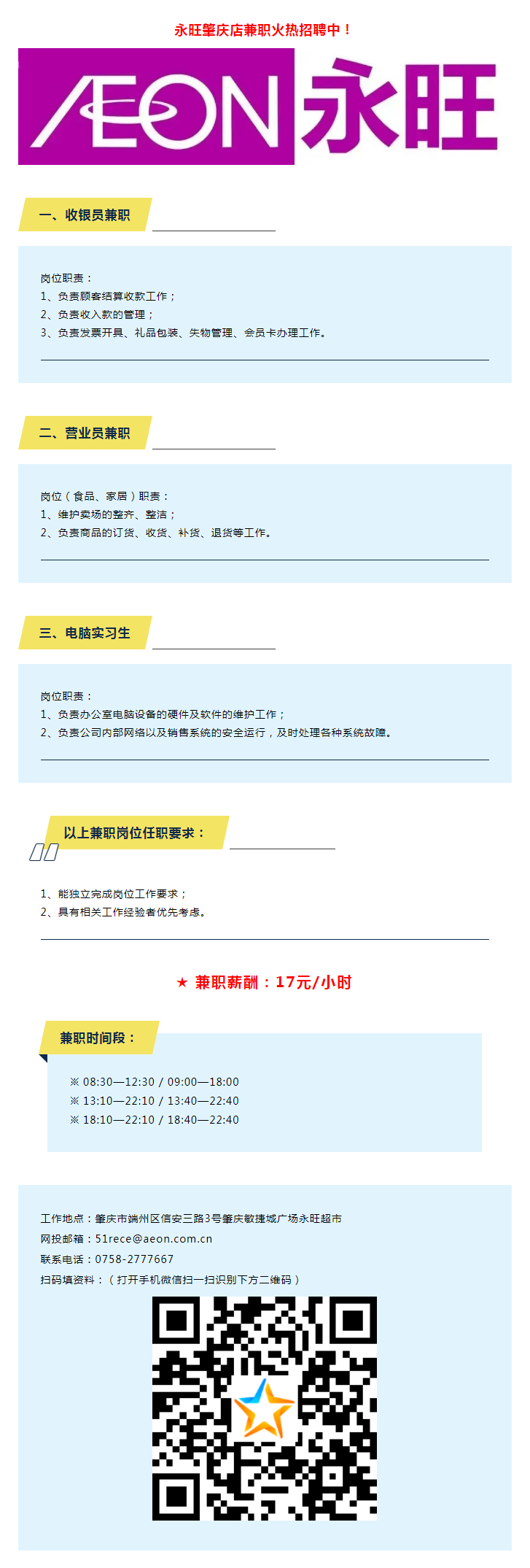 永旺肇慶店招聘電腦實習生,收銀/營業(yè)員兼職,17元/小時!